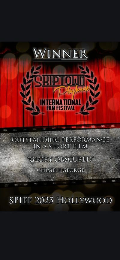 Thank you to the Skiptown Playhouse International Film Festival for honoring Chimele George with Outstanding Performance In A Short Film for his role as Raum in Glory Obscured. This performance was one of “Precision. Presence. No wasted motion. The kind of work that cuts through the noise and demands attention.“ This award was the first for Chimele and hopefully far from the last.